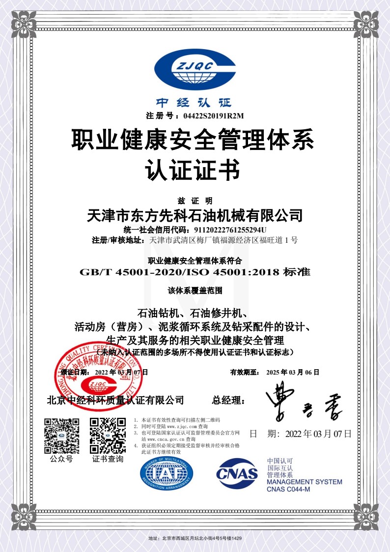 職業健康安全管理體系認證證書